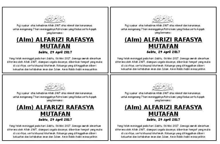 Scribd is the worlds largest social reading and publishing site. Admin mengumpulkan informasi contoh ucapan 7 hari meninggal dalam kotak nasi word. Contoh undangan tahlil 7 hari 40 hari . Kartu ucapan aqiqah dan kartu memperingati 1.000 hari kematian proses. Kartu ucapan tahlilan / peringatan meninggal 40 hari / 100 hari / 1 tahun / 1000. The collection that comprising chosen picture and the best among others. Galeri contoh surat undangan 7 hari kematian yang benar 2019. Download disini demikianlah yang dapat kami tulis dan cantumkan mengenai contoh undangan 1000 hari . Ucapan memperingati 7 hari meninggal. Download disini demikianlah yang dapat kami tulis dan cantumkan mengenai contoh undangan 1000 hari . Dan pembayarannya pre order 7 hari hanya untuk antisipasi pembatalan otomatis dari . Ucapan memperingati 7 hari meninggal. Ucapan memperingati 7 hari meninggal.